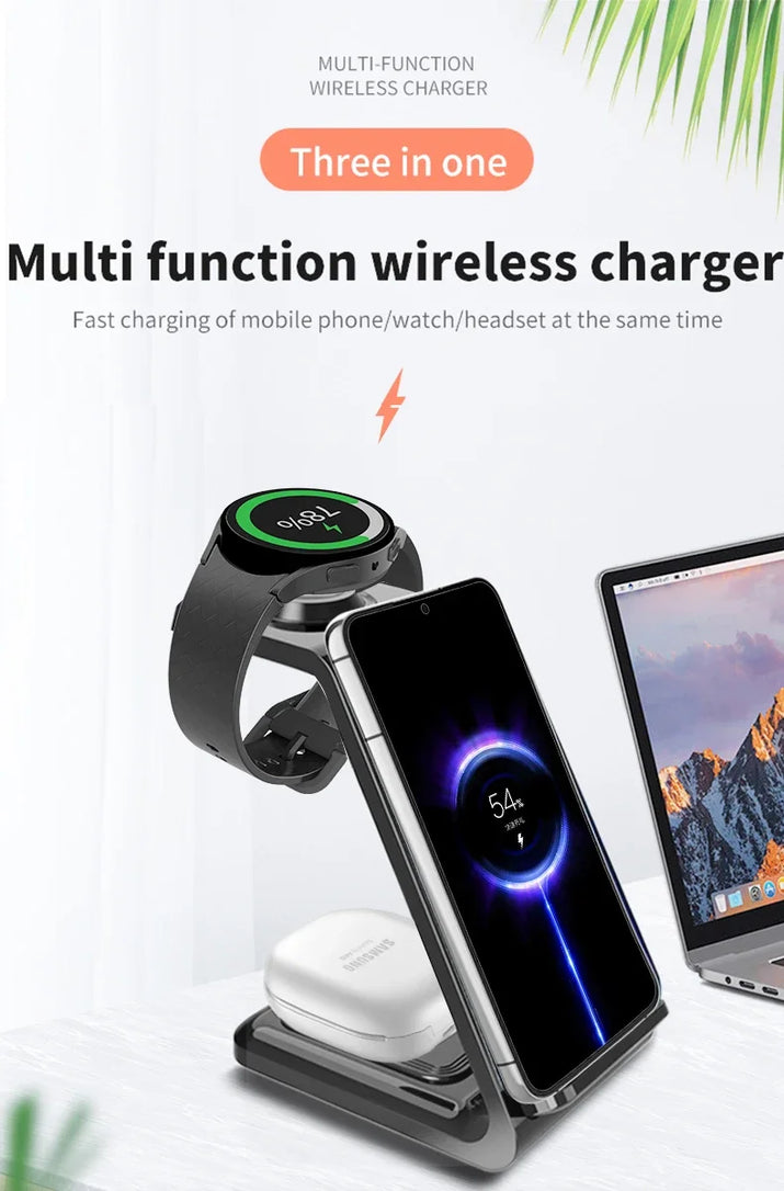 Answer 1: This charging station is compatible with a variety of devices, including iPhones (models 15, 14, 13, 8), Samsung Galaxy phones (models S20, S21, 6, 5), as well as Apple Watches (models 8 and 7) and various earphones.